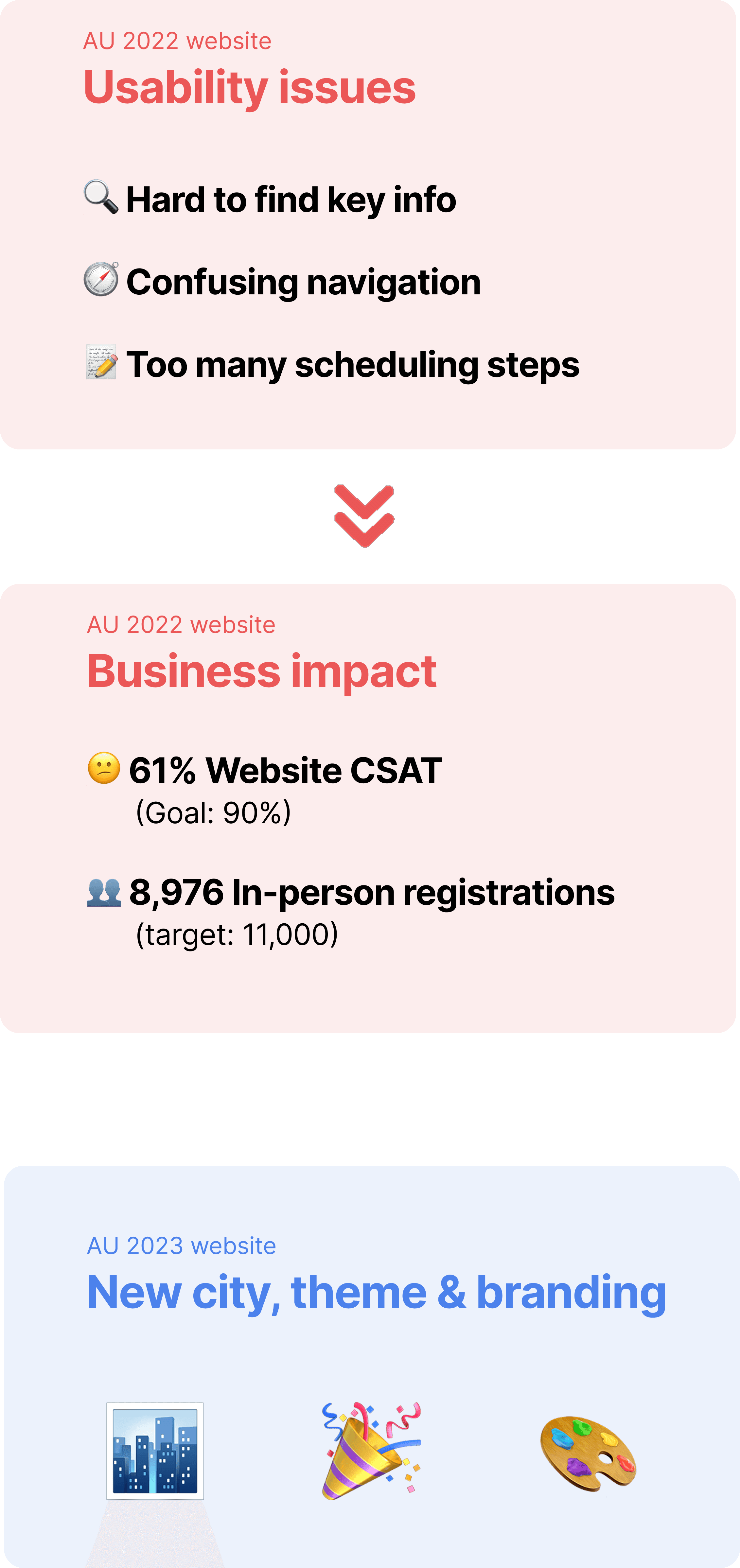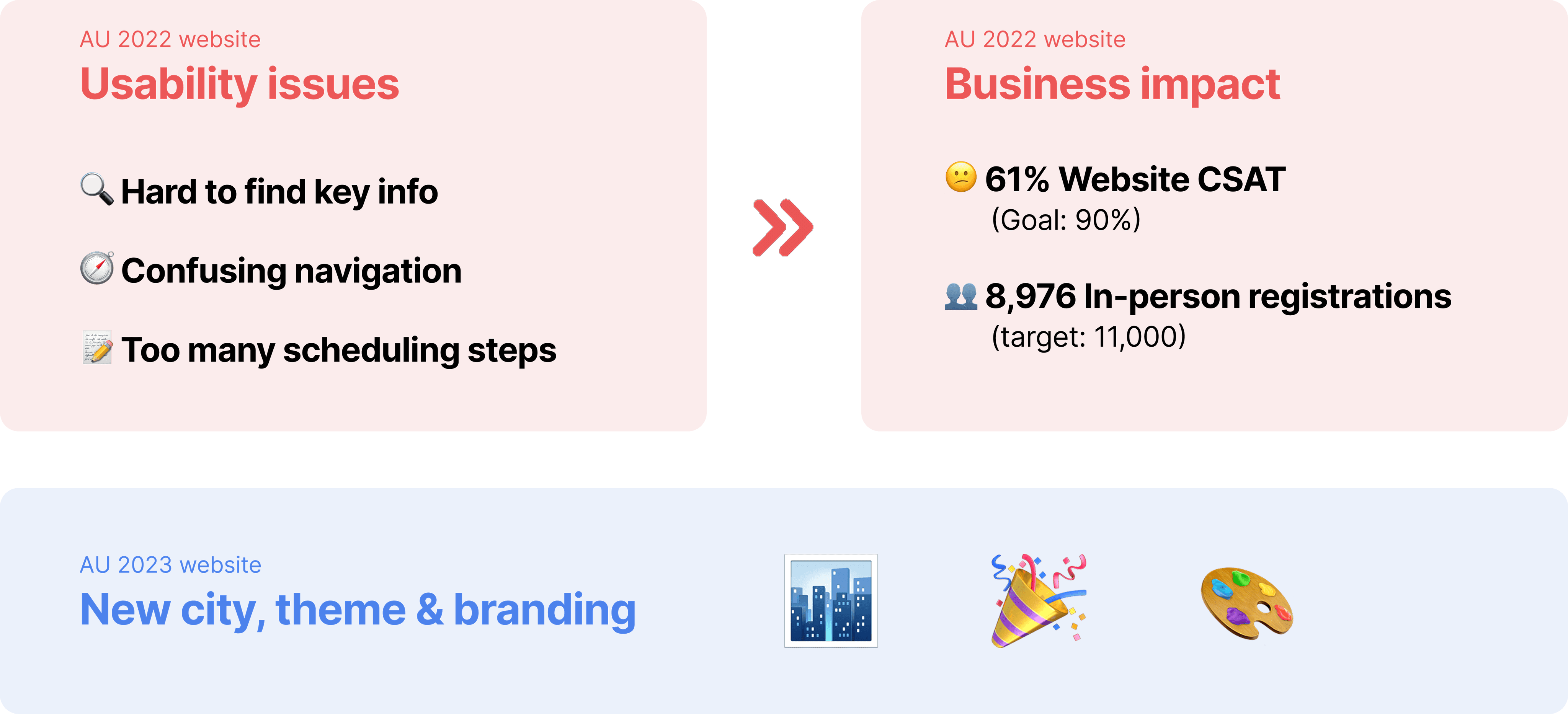 After two years of iteration, I improved the attendee experience, achieved a 90% CSAT, and helped reach the in-person engagement goal of 11,000 attendees.
