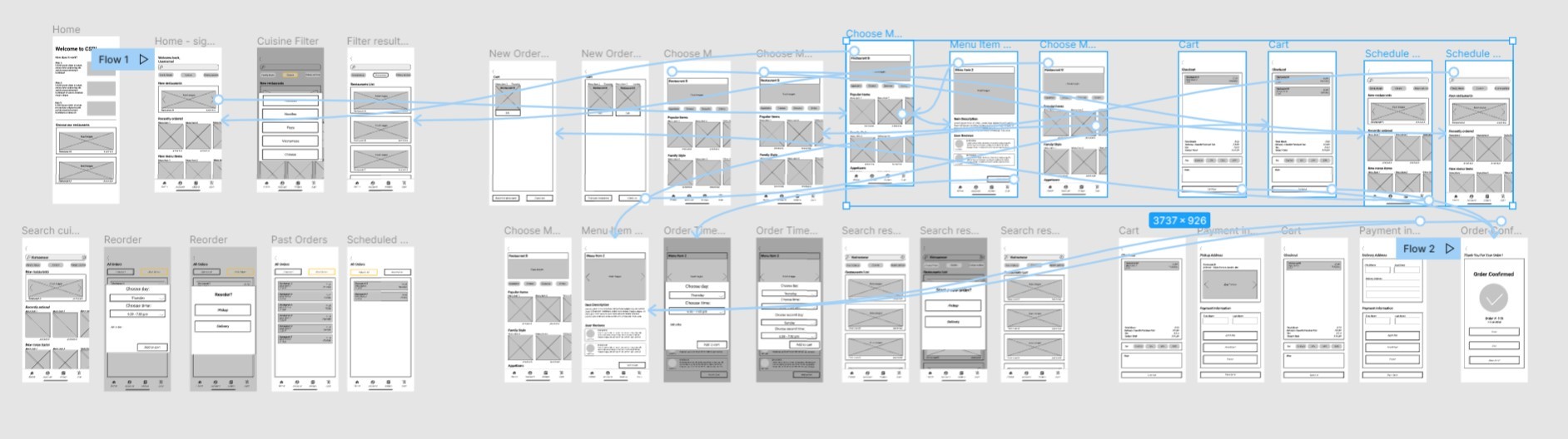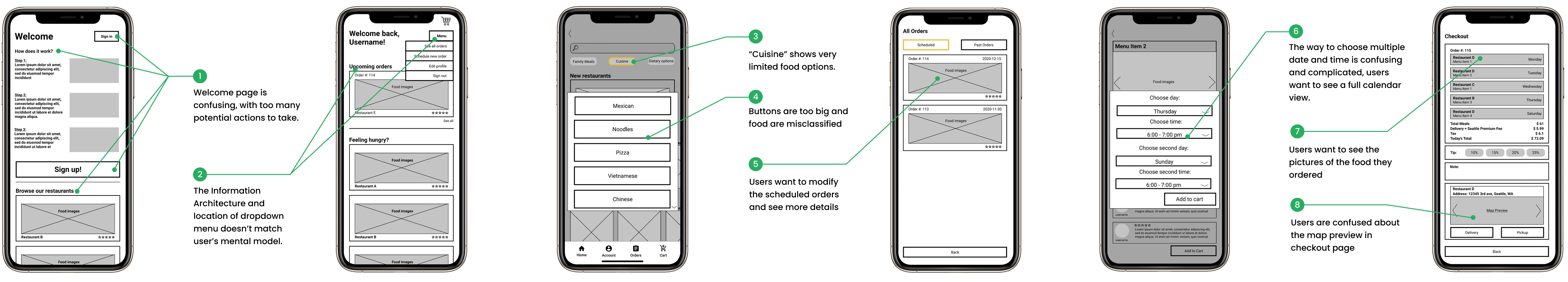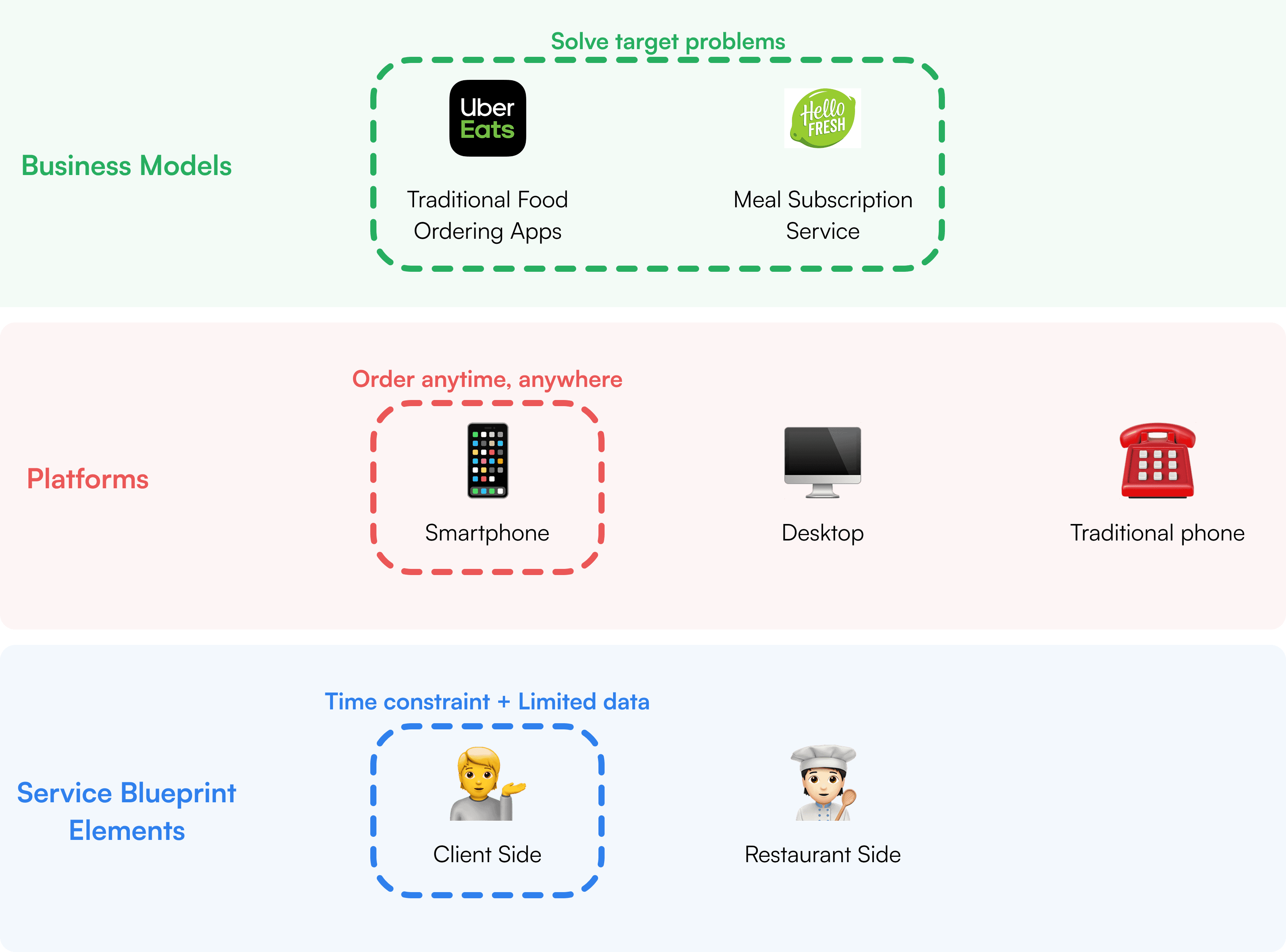 I explored business models, service blueprints, and platforms, ultimately choosing a mobile app integrating food ordering with meal subscriptions due to time constraints. Three usability tests refined the prototype.