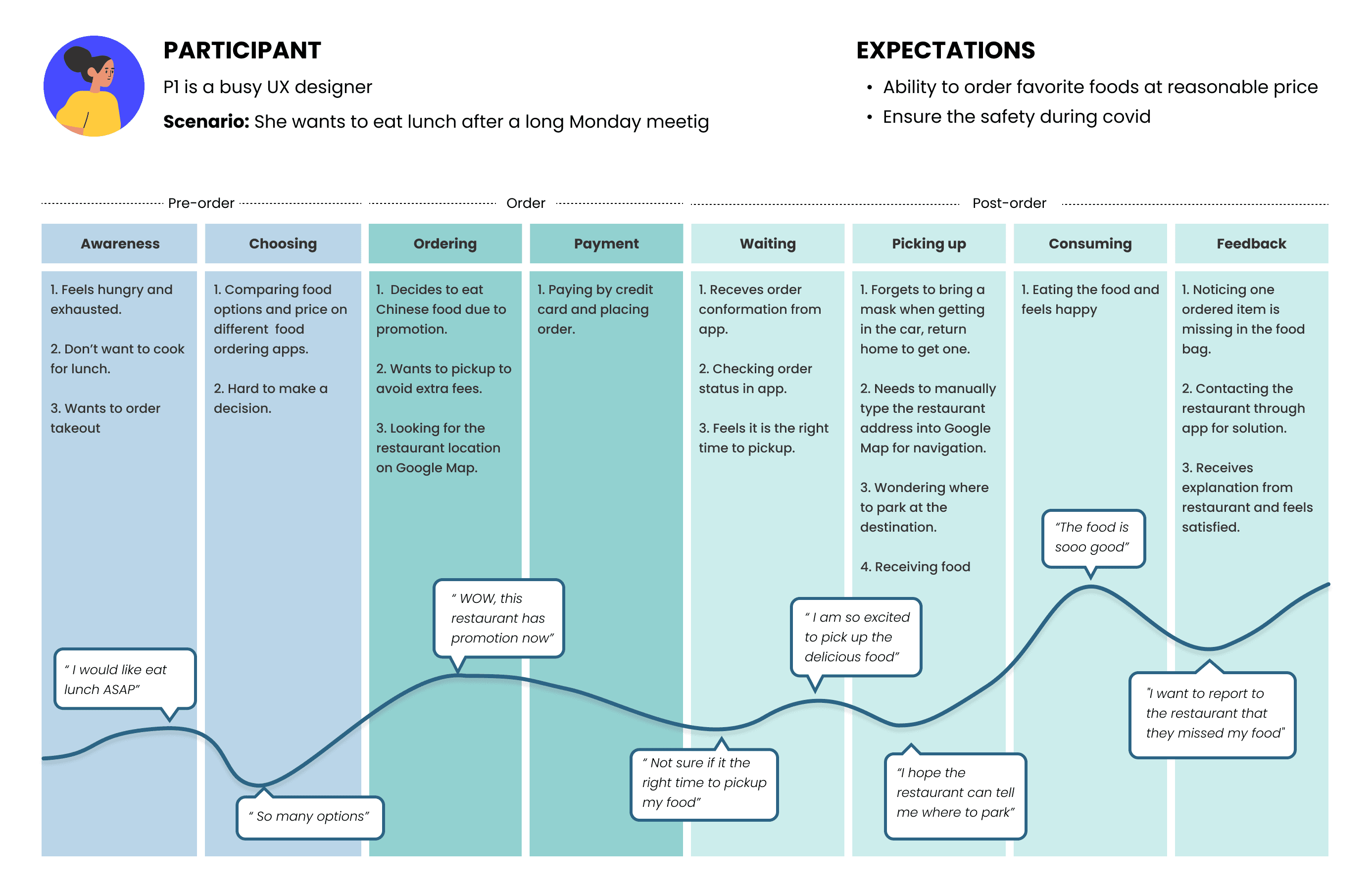Using my roommate's persona, I created a consumer journey map to show her food ordering experience with DoorDash from start to finish. It highlighted her needs, pain points, emotions at different stages.